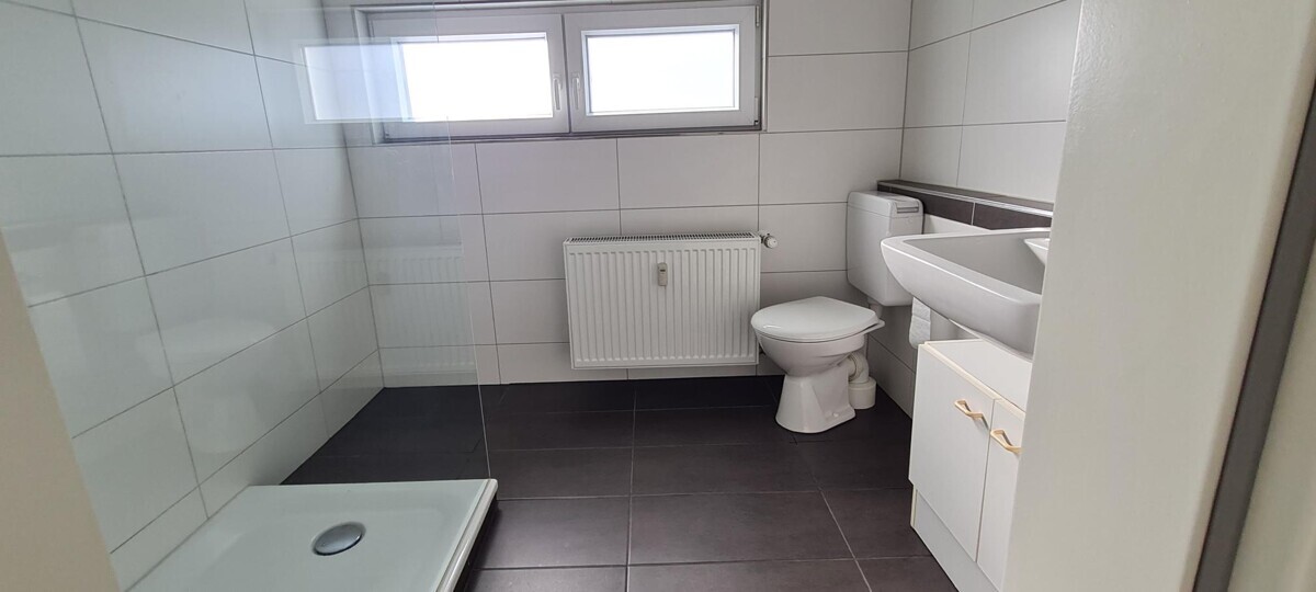 • saniertes Bad mit bodentiefer Duschtasse, Glastrennwand, Regenschauerdusche, WC,