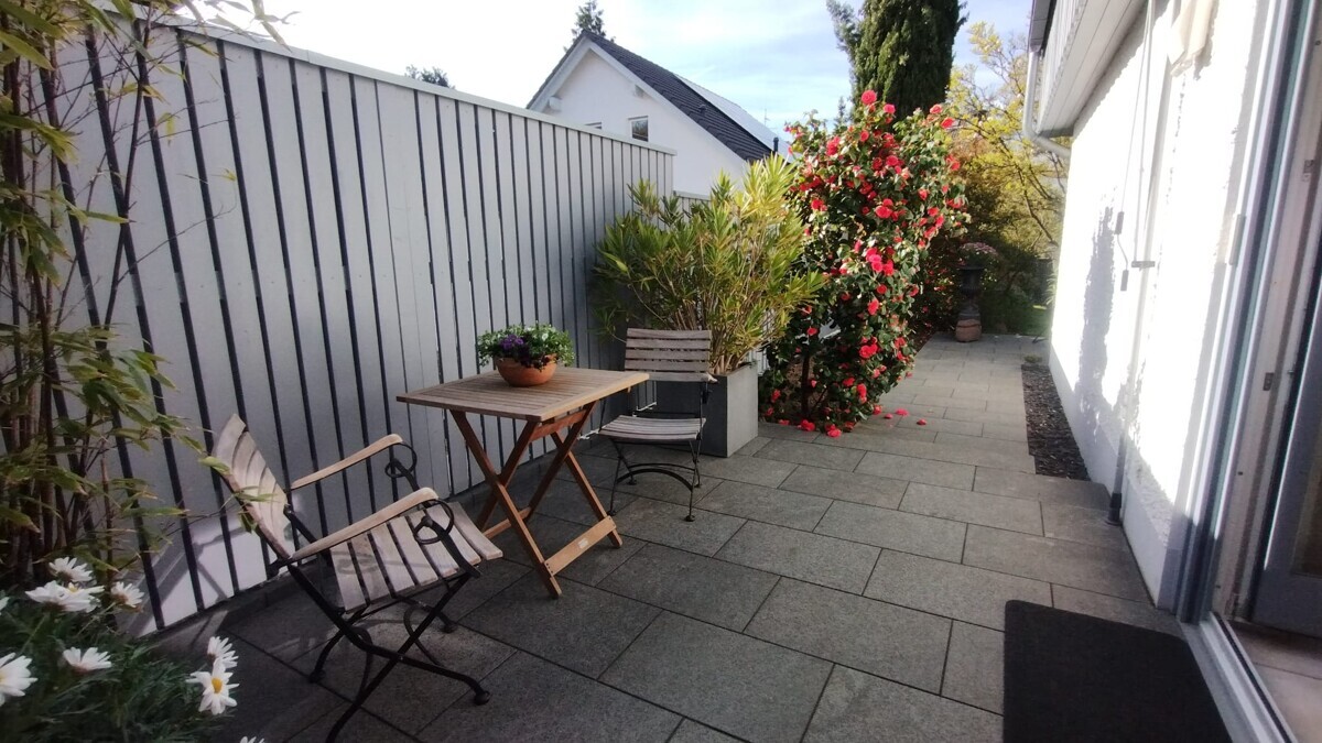 Großzügiges Wohn- und Esszimmer mit Zugang zur großen, überdachten Terrasse mit Loggia, Küche mit Einbauten, Schlafzimmer mit Einbauschrank, Badezimmer, Gäste-WC sowie Garderobenbereich mit Einbauschrank.