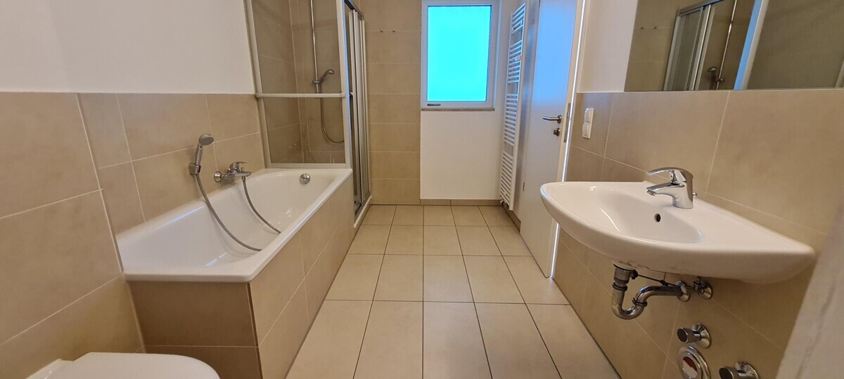 Diese stilvolle 2-Zimmer-Wohnung überzeugt durch moderne Architektur und eine klar strukturierte, durchdachte Raumaufteilung. Der offen gestaltete Wohn-, Ess- und Kochbereich bildet das Herzstück der Wohnung. Großzügige Fensterflächen sorgen für ein lichtdurchflutetes Ambiente und schaffen eine angenehme, einladende Wohnatmosphäre. Von hier aus gelangst Du auf den überdachten Balkon, der den Wohnraum harmonisch ins Freie erweitert.Ein separates Gäste-WC unterstreicht den hohen Wohnkomfort. Das Schlafzimmer verfügt über ein elegantes Badezimmer en Suite, ausgestattet mit Badewanne, Dusche sowie Anschlüssen für Waschmaschine und Trockner.
